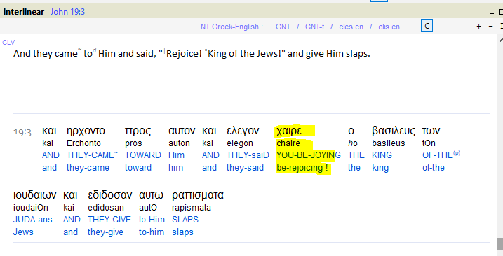 "Kính chào (Χαῖρε (chaire)), Vua của người Do Thái" (Giăng 19:3, Ma-thi-ơ 27:29, Mác 15:18)